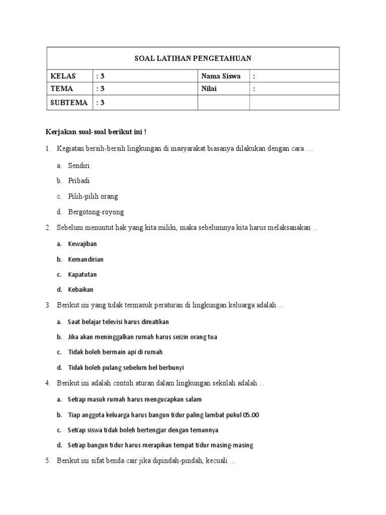 Soal Latihan Pengetahuan Kelas 3 Nama Siswa Tema 3 Nilai Subtema 3